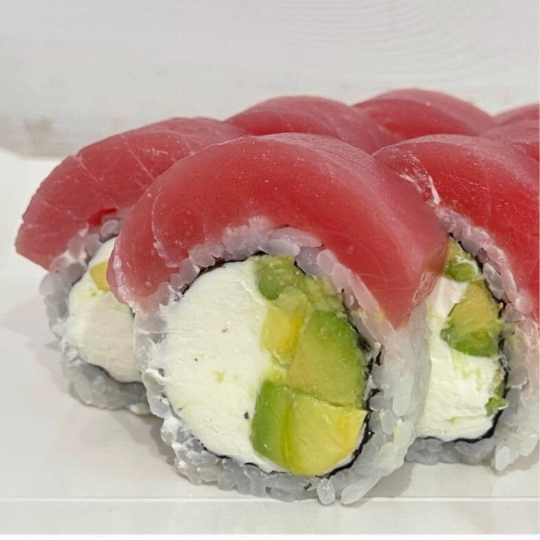 tuńczyk, nori, ryż, ser, ogórek, awokado, sos spicy[kropka]